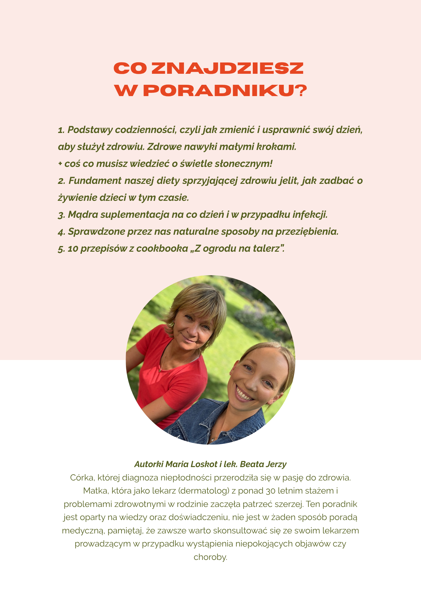 Co znajdziesz w poradniku? 1. Podstawy codzienności, czyli jak zmienić i usprawnić swój dzień, aby służył zdrowiu. Zdrowe nawyki małymi krokami.+ coś co musisz wiedzieć o świetle słonecznym!2. Fundament naszej diety sprzyjającej zdrowiu jelit, jak zadbać o żywienie dzieci w tym czasie.3. Mądra suplementacja na co dzień i w przypadku infekcji.4. Sprawdzone przez nas naturalne sposoby na przeziębienia.5. 10 przepisów z cookbooka „Z ogrodu na talerz”. Pobierz darmowy PLAN NAPRAWCZY ODPORNOŚCI i ciesz się silniejszym zdrowiem!